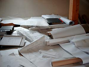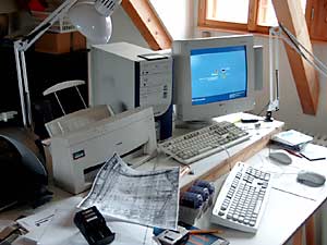 Der gewaltige Kamin ist ein Schaustück, geheizt wird zentral, die Räume mit Steinboden haben Fußbodenheizung. Man sieht deutlich, dass der Hausherr Architekt ist. |